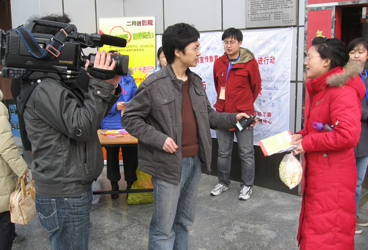 东城区工作人员在长虹影院门口对观众进行志愿者招募