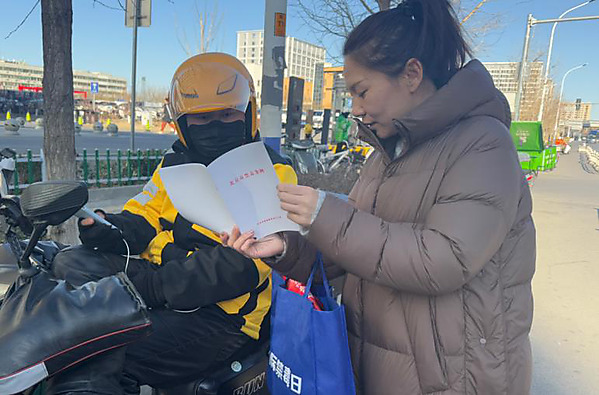 2025年2月17日,昌平区沙河镇走进玖耀里商区,对附近的外卖员开展了以“健康人生?绿色无毒”为主题的禁毒普法宣传活动,旨在提高他们对毒品危害的认识和法律意识,增强了外卖员的法治观念和社会责任感,确保社区安全。