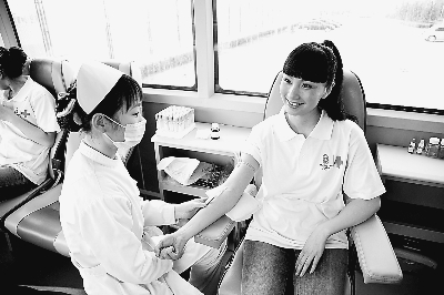 为保障奥运会、残奥会期间有充足、安全的血液供应,全国各地红十字会在2008年6月14日“世界献血者日”启动了无偿献血“生命奖章”活动。图为演员陶虹作为红十字志愿者在义务献血。
