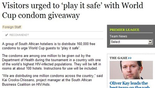 南非是全世界感染艾滋病毒最多的国家之一,本次世界杯,南非特地进口上百万避孕套以供游客使用,但这远远无法满足需求。英国此前更是无偿提供4千多万安全套给南非。有关部门将这些物品发放给世界杯赛场周围的100多家酒店,并且在里面附上详细使用说明。