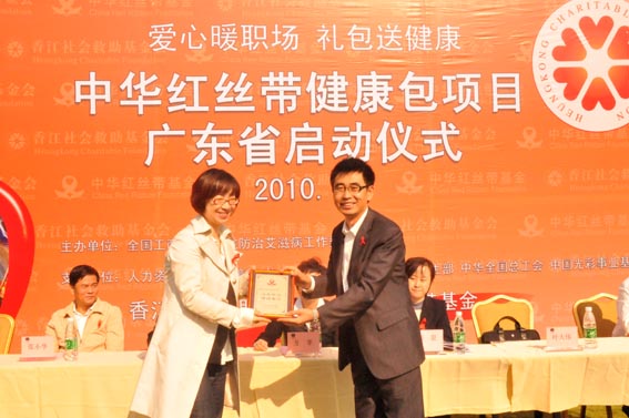 10月30日,红丝带健康包广东发放启动仪式在广州市番禺区锦绣香江花园的建筑工地内举行。广东省工商联副巡视员方苹、副处长张小华,广东省艾滋病防治研究所所长林鹏、广东省人保厅农工处副处长邱?,中华红丝带基金副秘书长叶大伟、香江社会救助基金会秘书长程瑶等出席了此次启动仪式。