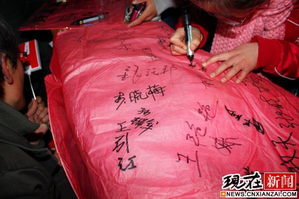 活动参与者们在孔明灯上签名留念。