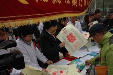 在活动指定地点,工作人员很快支起了宣传展板,布置好咨询台桌,各类宣传品整齐地摆在显眼的地方,立即吸引了街头过往群众的关注。2012年的宣传展板内容丰富,反映了陕西省艾滋病防治工作进展和所取得的成就,展出的艾滋病基本知识、国家政策和预防艾滋病传播的常识,配上了漫画式的图画和通俗易懂解说。为了扩大和提高宣传覆盖面和效果,事先设计了艾滋病防治知识知晓率调查问卷表,对参与答题的群众给予精美的宣传品鼓励,有效的调动了过往行人的参与热情。一时间,省疾控中心的展台前聚集了热心踊跃答题的群众,很快几十支答题笔都不够同时答题用了。王主任和艾防科工作人员对群众现场提问的问题进行了耐心解答。省艾协、西安市社区工作组代表和志愿者也一同参加了现场宣传和问卷调查活动。长安大学的青年志愿者队伍早早来到今天的活动现场,他们通过派发艾滋病宣传折页、传单、海报等宣传材料、现场签名行动,倡导正确看待艾滋病并健康生活,努力营造和谐的生活环境。
