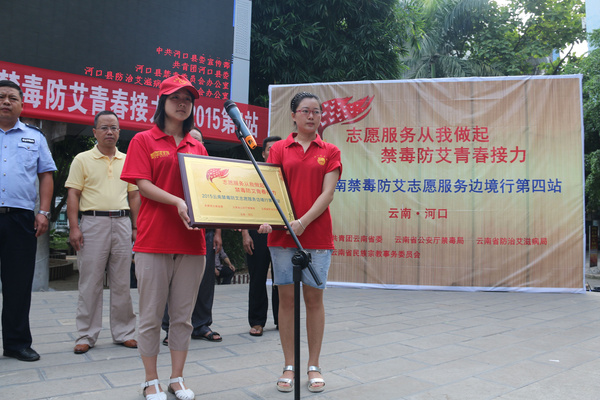 此次仪式中,由禁毒防艾边境行第一队志愿者马锐代表活动主办单位向河口县授牌,河口团县委志愿者代表接牌,团县委书记谢圆圆宣布活动启动。