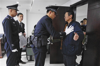 12月5日,丰台法院,谭某进入法庭前,法警对其进行安全检查。