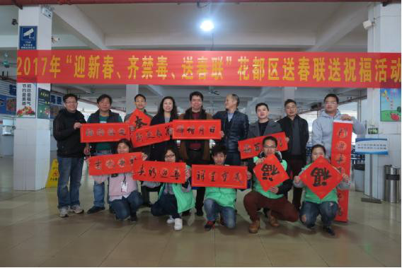 中国禁毒网讯 2017年春节即将来临,家家户户都在喜庆地筹备过年的物品,其中当然包括春联。在这辞岁迎新之际,2017年1月13日至20日,广州市花都区委宣传部联合广州市花都区禁毒委员会办公室先后到花东拓璞电器塑胶分厂、南部战区陆军某集训基地和炭步镇鸭湖市场等单位开展以“迎新春、齐禁毒、送春联、送祝福”为主题的禁毒宣传活动。