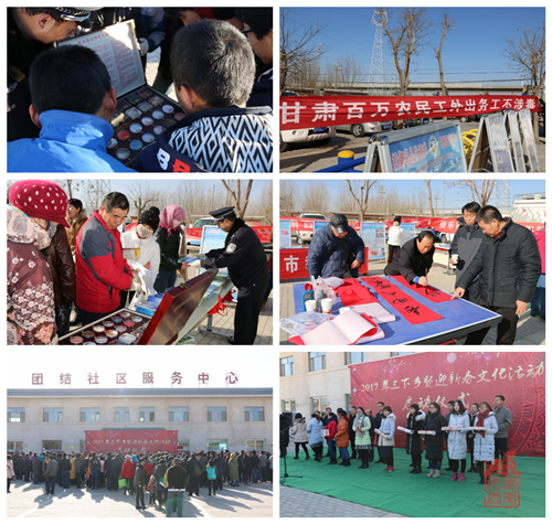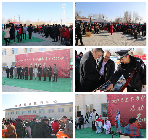 2017年1月18日,是文殊镇逢8集市的日子,嘉峪关市委、市人大、市政府、市政协组织雄关、镜铁、长城三区区委、共青团市委、科技局、文广新局、卫计委、农林局、教育局、司法局、市环保局、市场监管局,市文联、市妇联、市科协、市书法家协会、市摄影家协会、市野生动物保护协会等二十多家单位和民间组织,在文殊镇团结社区(镇政府驻地)举办由市委宣传部主办、文殊镇承办的嘉峪关市2017年科技、文化、卫生“三下乡”启动仪式。“禁毒关爱送温馨,文明过节昌新风”。