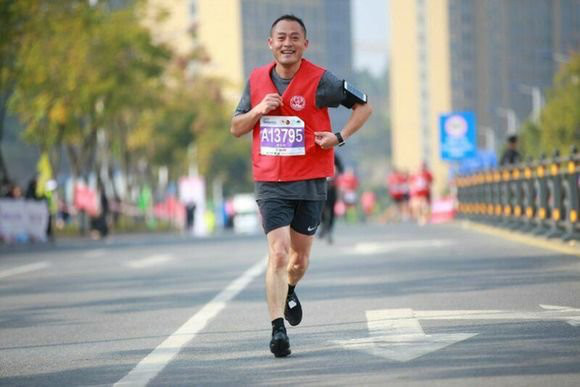 在数万名选手中,有一抹红色尤为亮眼,他身穿胸前印有“中国国家禁毒委员会“标志、背后印有”江汉禁毒“四个大字的红色背心。他就是来自武汉市江汉区北湖街道的一名专职禁毒社工杜玉龙。