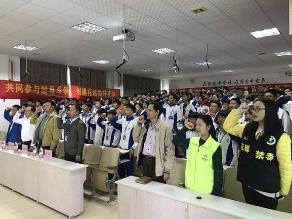 本次活动通过禁毒知识宣讲、全体宣誓、代表签名及禁毒展览等方式进行。在活动的第一环节,花城街禁毒办工作人员利用禁毒宣传片及色彩鲜明的PPT,向在场学生传播禁毒知识,令学生明确毒品的严重危害;随后,在禁毒专职人员的带领下,全体人员进行简单而庄重的宣誓仪式,一句响亮的“珍爱生命,远离毒品”表明了在场学生对于禁绝毒品的决心,并共同在禁毒横幅上签名,再次表明禁毒的决心。