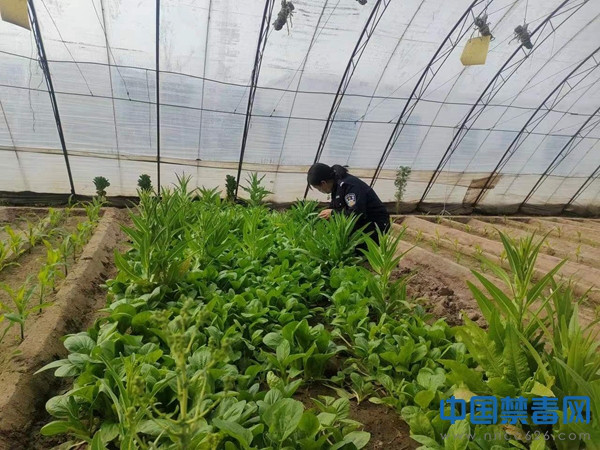 图为禁毒工作人员对蔬菜大棚进行检查。中国禁毒网发