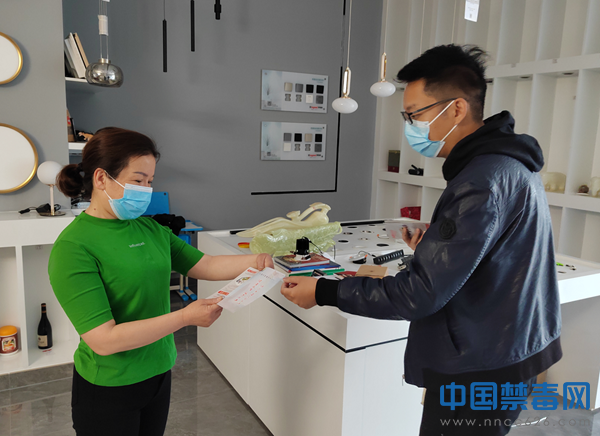 图为禁毒志愿者向商铺负责人发放禁毒宣传资料。中国禁毒网发