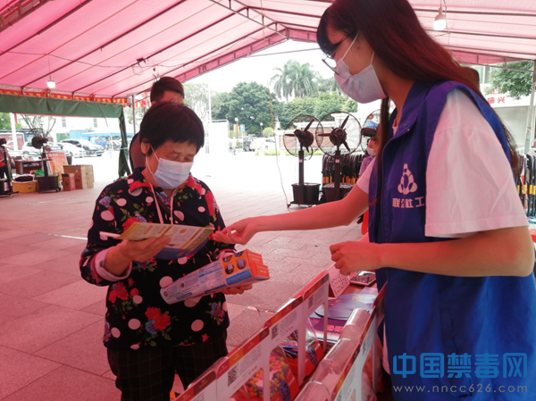 图为禁毒社工向群众发放禁毒宣传单张。中国禁毒网发