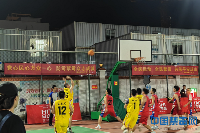 中国禁毒网讯 近日,海南省海口市琼山区在滨江街道双创广场篮球场举办“禁毒杯”职工篮球赛。来自琼山区机关企事业单位的10支代表队170名职工及禁毒志愿者参加篮球比赛,赛事为期7天。