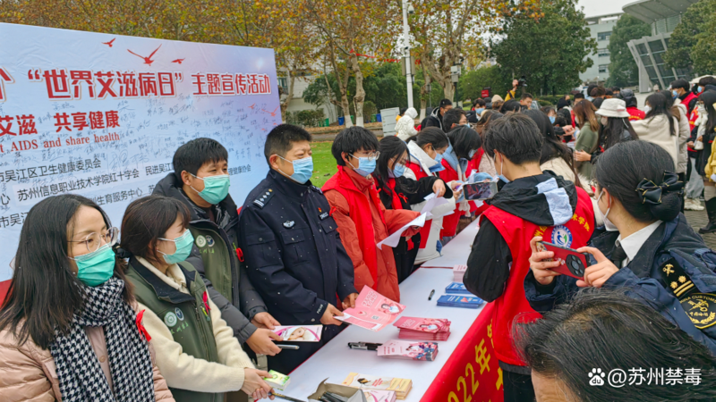 为进一步加强校园禁毒防艾宣传工作,增强辖区学生的禁毒意识,11月30日,吴江区公安局禁毒大队、吴江区自强服务社会同区疾控中心、区红十字会在苏州信息职业技术学院思源广场开展“2022年苏州市吴江区第35个‘世界艾滋病日’主题宣传活动”。