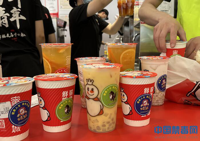图为工作人员在奶茶上贴禁毒宣传贴纸。中国禁毒网发