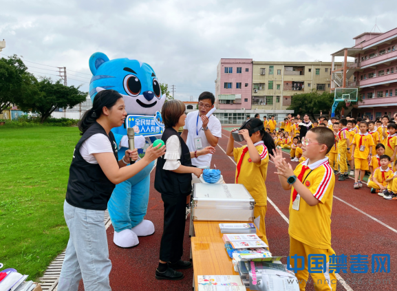 图为禁毒工作人员与学生进行禁毒游戏。中国禁毒网发