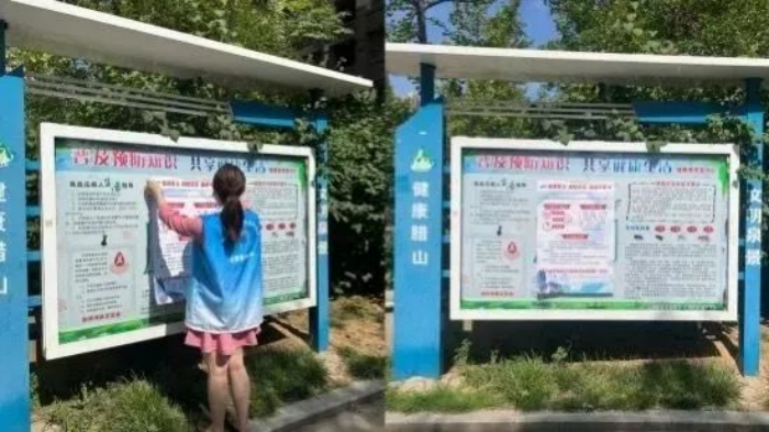 社区工作人员在社区宣传栏内张贴艾滋病防治宣传海报,发放预防艾滋病宣传页,向广大居民耐心地宣传普及艾滋病的危害、传播途径、流行态势和预防措施等相关知识,倡议居民在生活中尽一切可能抵制艾滋病的侵袭,积极引导辖区居民正视艾滋病、关注艾滋病、预防艾滋病。