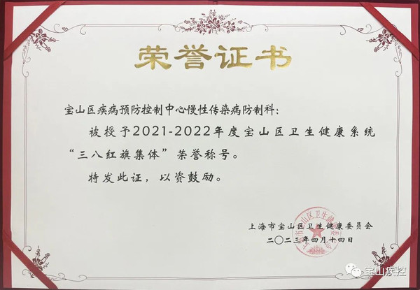 宝山区疾病预防控制中心慢性传染病防制科荣获2021-2022年度宝山区卫生健康系统“三八红旗集体”荣誉称号。