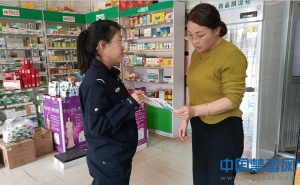 图为禁毒专干向药店从业人员发放禁毒宣传彩页。中国禁毒网发