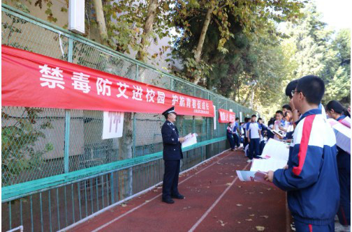 普法队员为同学们发放了禁毒防艾宣传手册,耐心地讲解毒品的种类、危害和禁毒防艾知识。