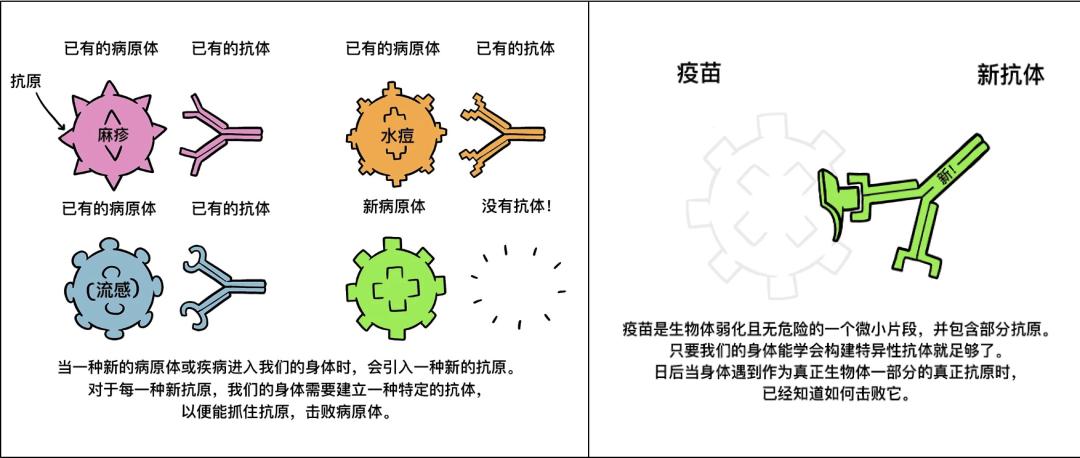 而世界卫生组织对于“疫苗”的定义是,用于预防传染病的生物制品,简单来说就是用病原体中一些不会致病的物质去刺激免疫系统,让免疫系统产生相对应的记忆。当真正致病的病原体入侵身体时,免疫系统便能够凭据之前的记忆快速反应,阻止来自病原体的伤害。上述这个过程被称为免疫反应[5]。