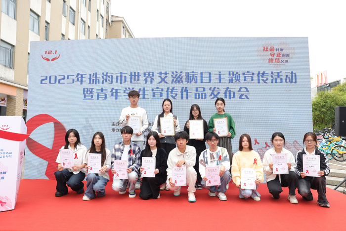 活动现场亮点纷呈,不仅正式发布了展现珠海市大学生志愿者防艾工作实况的宣传片《“与艾同行”—— 记珠海大学生志愿者 “防艾日常”》,还为 2025 年度大学生预防艾滋病宣传教育作品征集大赛的获奖作品进行了颁奖。据悉,本次大赛共征集到来自 8 所高校的 45 份学生作品,作品紧扣大学生预防艾滋病主体职责、艾滋病反歧视、检测与治疗、防艾知识与技能等核心主题展开创作与展示,最终评选出一等奖 1 名、二等奖 2 名、三等奖 3 名以及优秀奖 10 名。近年来,在市教育局,市卫健局的宣传引导下,各高校积极培养青年学生志愿者参与防艾宣传。现有骨干志愿者20余名。这些美丽的身影为校园防艾增添了一道亮丽的风景线。