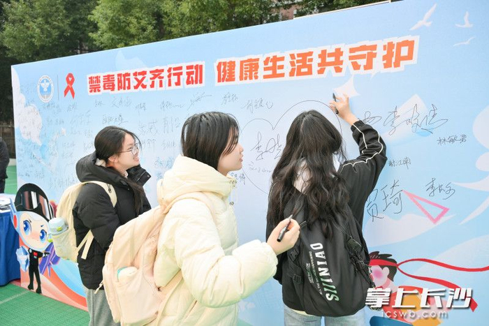 “一条红丝带,传递爱与希望”——签名墙前,师生们郑重签下姓名,许下共建健康校园的承诺。湘江新区政法工作部二级调研员周永顺在致辞中表示,将持续推进“禁毒+防艾”融合宣传,为青年学子织密健康防护网。